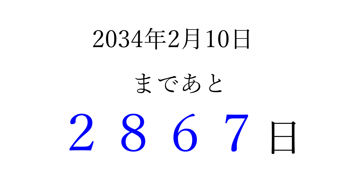 2034年2月10日(金)まで あと 9999 日です 追加すると、トップページからすぐ選べるようになります ※2026/04/06現在の結果です。 最新の状態に更新する ↓シェアして、タイムライン上にカウントダウンを表示しよう!↓ 📤 この結果を共有する Tweet シェア Threads Bluesky 別の日付でカウントダウン 2034年2月のカレンダー このページをブックマークに追加すると、いつでもカウントダウンを確認できます。 (PC: Ctrl+D / Mac: ⌘+D) hitome-notes.comでは以下のページも運営しています。 指定日と期間から日付を計算 | ガチャ確率計算・シミュレーション | プライバシー・ポリシー 運営者:Avocado