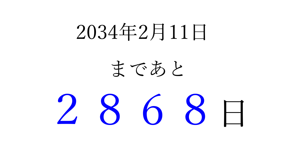 2034年2月11日(土)まで あと 9999 日です 追加すると、トップページからすぐ選べるようになります ※2026/04/06現在の結果です。 最新の状態に更新する ↓シェアして、タイムライン上にカウントダウンを表示しよう!↓ 📤 この結果を共有する Tweet シェア Threads Bluesky 別の日付でカウントダウン 2034年2月のカレンダー このページをブックマークに追加すると、いつでもカウントダウンを確認できます。 (PC: Ctrl+D / Mac: ⌘+D) hitome-notes.comでは以下のページも運営しています。 指定日と期間から日付を計算 | ガチャ確率計算・シミュレーション | プライバシー・ポリシー 運営者:Avocado