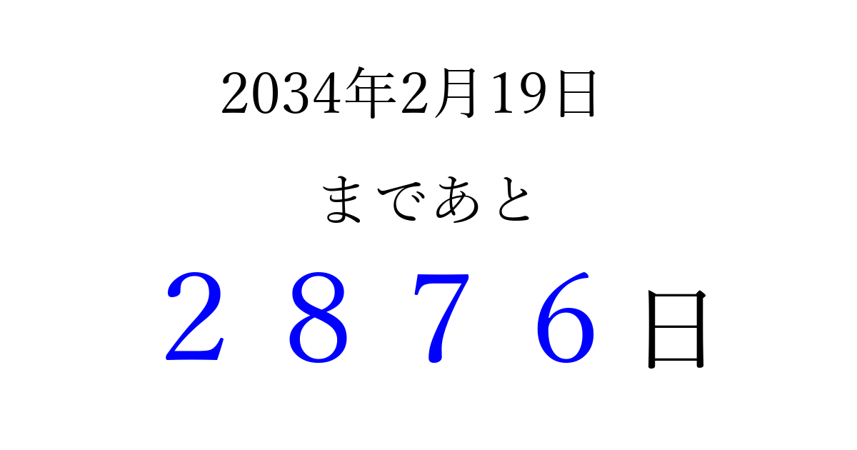 2034年2月19日(日)まで あと 9999 日です 追加すると、トップページからすぐ選べるようになります ※2026/04/06現在の結果です。 最新の状態に更新する ↓シェアして、タイムライン上にカウントダウンを表示しよう!↓ 📤 この結果を共有する Tweet シェア Threads Bluesky 別の日付でカウントダウン 2034年2月のカレンダー このページをブックマークに追加すると、いつでもカウントダウンを確認できます。 (PC: Ctrl+D / Mac: ⌘+D) hitome-notes.comでは以下のページも運営しています。 指定日と期間から日付を計算 | ガチャ確率計算・シミュレーション | プライバシー・ポリシー 運営者:Avocado