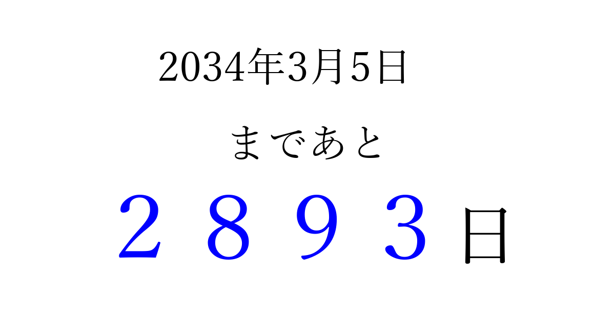 2034年3月5日(日)まで あと 9999 日です 追加すると、トップページからすぐ選べるようになります ※2026/04/03現在の結果です。 最新の状態に更新する ↓シェアして、タイムライン上にカウントダウンを表示しよう!↓ 📤 この結果を共有する Tweet シェア Threads Bluesky 別の日付でカウントダウン 2034年3月のカレンダー このページをブックマークに追加すると、いつでもカウントダウンを確認できます。 (PC: Ctrl+D / Mac: ⌘+D) hitome-notes.comでは以下のページも運営しています。 指定日と期間から日付を計算 | ガチャ確率計算・シミュレーション | プライバシー・ポリシー 運営者:Avocado