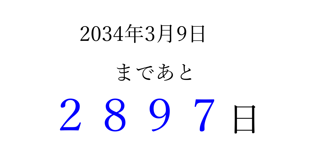 2034年3月9日(木)まで あと 9999 日です 追加すると、トップページからすぐ選べるようになります ※2026/04/03現在の結果です。 最新の状態に更新する ↓シェアして、タイムライン上にカウントダウンを表示しよう!↓ 📤 この結果を共有する Tweet シェア Threads Bluesky 別の日付でカウントダウン 2034年3月のカレンダー このページをブックマークに追加すると、いつでもカウントダウンを確認できます。 (PC: Ctrl+D / Mac: ⌘+D) hitome-notes.comでは以下のページも運営しています。 指定日と期間から日付を計算 | ガチャ確率計算・シミュレーション | プライバシー・ポリシー 運営者:Avocado