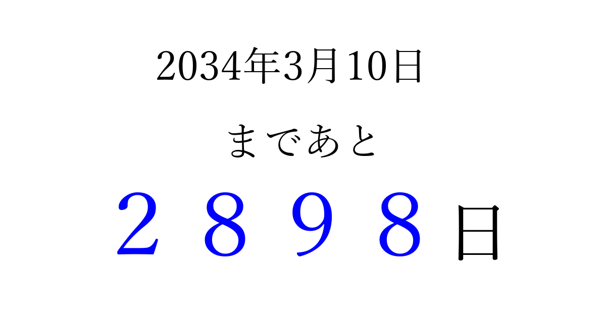 2034年3月10日(金)まで あと 9999 日です 追加すると、トップページからすぐ選べるようになります ※2026/04/03現在の結果です。 最新の状態に更新する ↓シェアして、タイムライン上にカウントダウンを表示しよう!↓ 📤 この結果を共有する Tweet シェア Threads Bluesky 別の日付でカウントダウン 2034年3月のカレンダー このページをブックマークに追加すると、いつでもカウントダウンを確認できます。 (PC: Ctrl+D / Mac: ⌘+D) hitome-notes.comでは以下のページも運営しています。 指定日と期間から日付を計算 | ガチャ確率計算・シミュレーション | プライバシー・ポリシー 運営者:Avocado