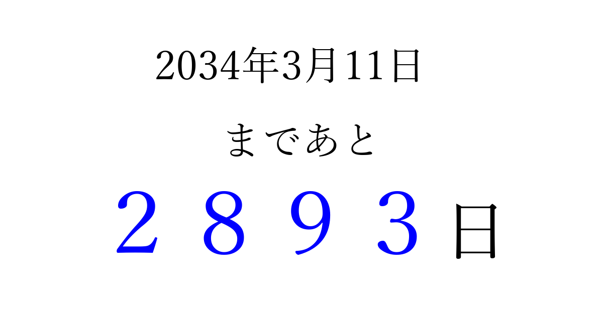 2034年3月11日(土)まで あと 9999 日です 追加すると、トップページからすぐ選べるようになります ※2026/04/09現在の結果です。 最新の状態に更新する ↓シェアして、タイムライン上にカウントダウンを表示しよう!↓ 📤 この結果を共有する Tweet シェア Threads Bluesky 別の日付でカウントダウン 2034年3月のカレンダー このページをブックマークに追加すると、いつでもカウントダウンを確認できます。 (PC: Ctrl+D / Mac: ⌘+D) hitome-notes.comでは以下のページも運営しています。 指定日と期間から日付を計算 | ガチャ確率計算・シミュレーション | プライバシー・ポリシー 運営者:Avocado
