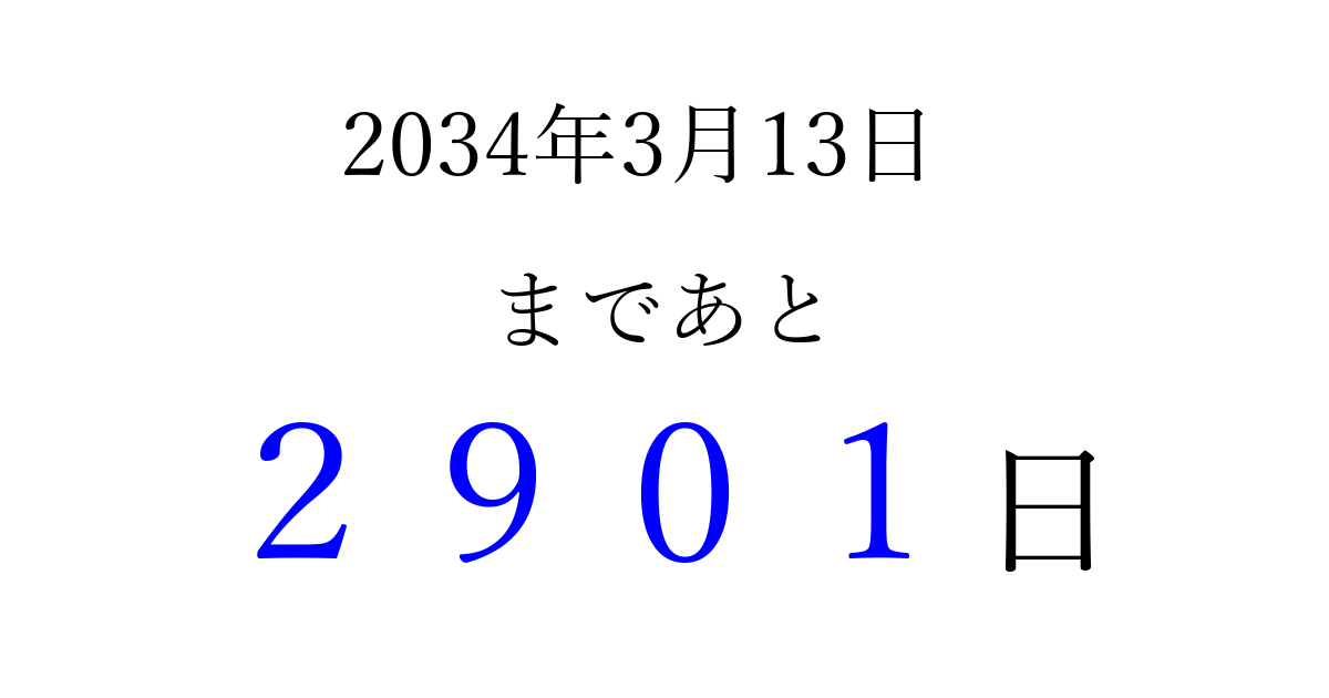 2034年3月13日(月)まで あと 9999 日です 追加すると、トップページからすぐ選べるようになります ※2026/04/03現在の結果です。 最新の状態に更新する ↓シェアして、タイムライン上にカウントダウンを表示しよう!↓ 📤 この結果を共有する Tweet シェア Threads Bluesky 別の日付でカウントダウン 2034年3月のカレンダー このページをブックマークに追加すると、いつでもカウントダウンを確認できます。 (PC: Ctrl+D / Mac: ⌘+D) hitome-notes.comでは以下のページも運営しています。 指定日と期間から日付を計算 | ガチャ確率計算・シミュレーション | プライバシー・ポリシー 運営者:Avocado