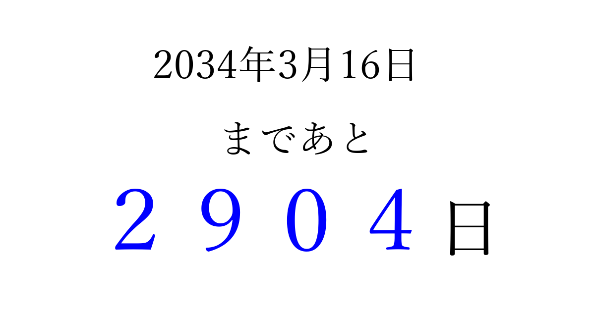2034年3月16日(木)まで あと 9999 日です 追加すると、トップページからすぐ選べるようになります ※2026/04/03現在の結果です。 最新の状態に更新する ↓シェアして、タイムライン上にカウントダウンを表示しよう!↓ 📤 この結果を共有する Tweet シェア Threads Bluesky 別の日付でカウントダウン 2034年3月のカレンダー このページをブックマークに追加すると、いつでもカウントダウンを確認できます。 (PC: Ctrl+D / Mac: ⌘+D) hitome-notes.comでは以下のページも運営しています。 指定日と期間から日付を計算 | ガチャ確率計算・シミュレーション | プライバシー・ポリシー 運営者:Avocado