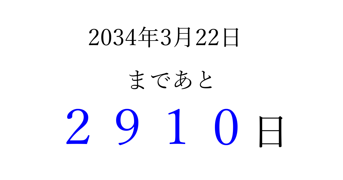 2034年3月22日(水)まで あと 9999 日です 追加すると、トップページからすぐ選べるようになります ※2026/04/03現在の結果です。 最新の状態に更新する ↓シェアして、タイムライン上にカウントダウンを表示しよう!↓ 📤 この結果を共有する Tweet シェア Threads Bluesky 別の日付でカウントダウン 2034年3月のカレンダー このページをブックマークに追加すると、いつでもカウントダウンを確認できます。 (PC: Ctrl+D / Mac: ⌘+D) hitome-notes.comでは以下のページも運営しています。 指定日と期間から日付を計算 | ガチャ確率計算・シミュレーション | プライバシー・ポリシー 運営者:Avocado