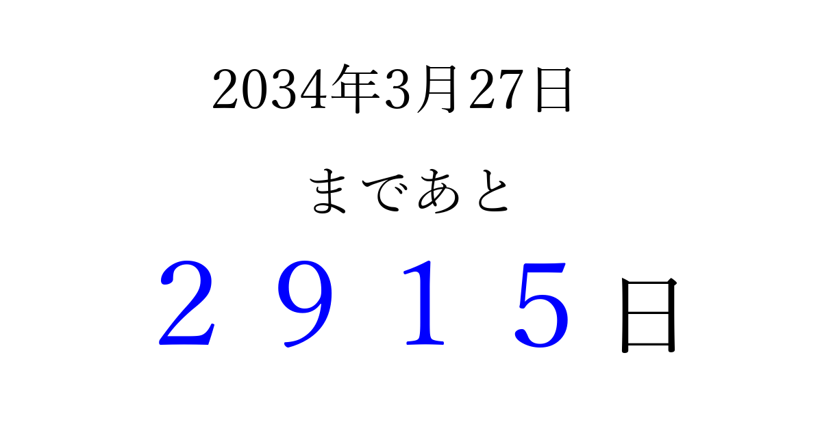 2034年3月27日(月)まで あと 9999 日です 追加すると、トップページからすぐ選べるようになります ※2026/04/03現在の結果です。 最新の状態に更新する ↓シェアして、タイムライン上にカウントダウンを表示しよう!↓ 📤 この結果を共有する Tweet シェア Threads Bluesky 別の日付でカウントダウン 2034年3月のカレンダー このページをブックマークに追加すると、いつでもカウントダウンを確認できます。 (PC: Ctrl+D / Mac: ⌘+D) hitome-notes.comでは以下のページも運営しています。 指定日と期間から日付を計算 | ガチャ確率計算・シミュレーション | プライバシー・ポリシー 運営者:Avocado