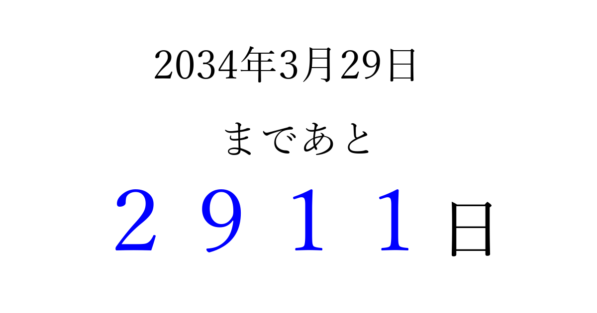 2034年3月29日(水)まで あと 9999 日です 追加すると、トップページからすぐ選べるようになります ※2026/04/09現在の結果です。 最新の状態に更新する ↓シェアして、タイムライン上にカウントダウンを表示しよう!↓ 📤 この結果を共有する Tweet シェア Threads Bluesky 別の日付でカウントダウン 2034年3月のカレンダー このページをブックマークに追加すると、いつでもカウントダウンを確認できます。 (PC: Ctrl+D / Mac: ⌘+D) hitome-notes.comでは以下のページも運営しています。 指定日と期間から日付を計算 | ガチャ確率計算・シミュレーション | プライバシー・ポリシー 運営者:Avocado