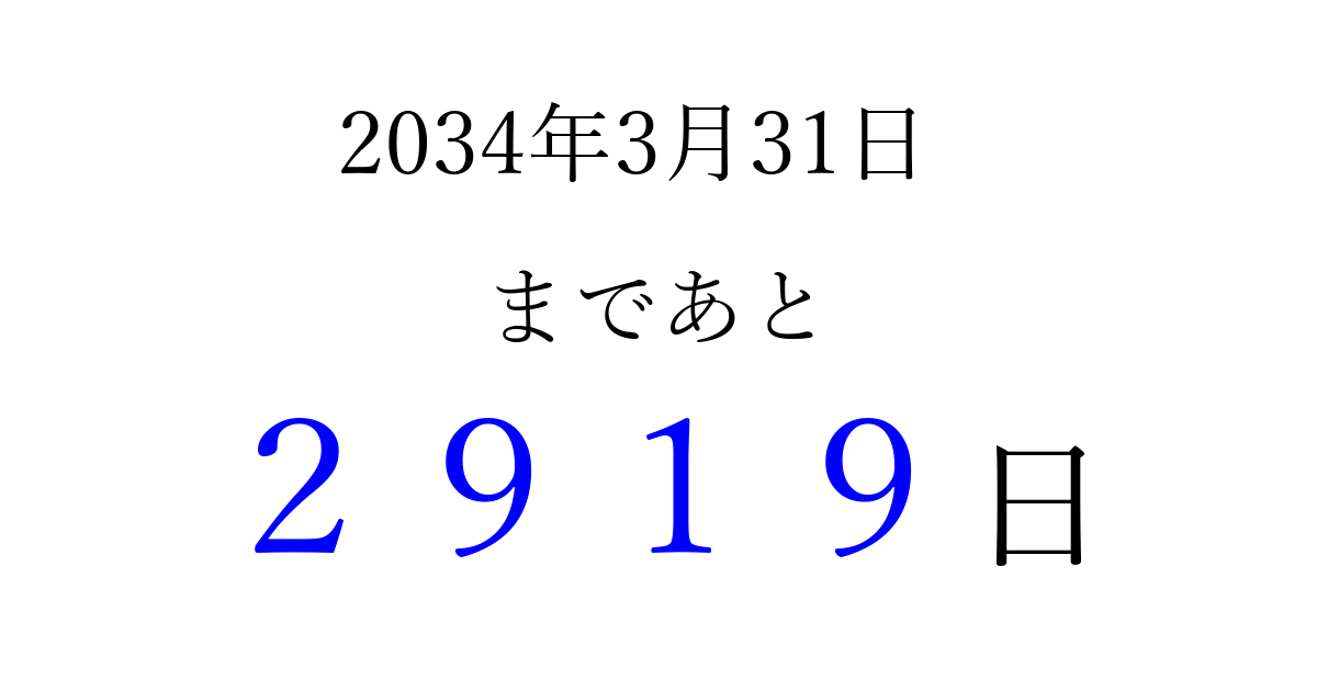 2034年3月31日(金)まで あと 9999 日です 追加すると、トップページからすぐ選べるようになります ※2026/04/03現在の結果です。 最新の状態に更新する ↓シェアして、タイムライン上にカウントダウンを表示しよう!↓ 📤 この結果を共有する Tweet シェア Threads Bluesky 別の日付でカウントダウン 2034年3月のカレンダー このページをブックマークに追加すると、いつでもカウントダウンを確認できます。 (PC: Ctrl+D / Mac: ⌘+D) hitome-notes.comでは以下のページも運営しています。 指定日と期間から日付を計算 | ガチャ確率計算・シミュレーション | プライバシー・ポリシー 運営者:Avocado