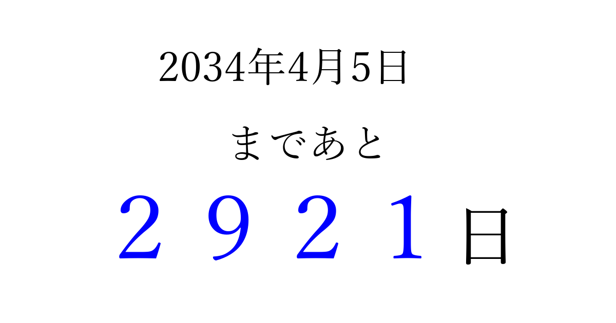 2034年4月5日(水)まで あと 9999 日です 追加すると、トップページからすぐ選べるようになります ※2026/04/06現在の結果です。 最新の状態に更新する ↓シェアして、タイムライン上にカウントダウンを表示しよう!↓ 📤 この結果を共有する Tweet シェア Threads Bluesky 別の日付でカウントダウン 2034年4月のカレンダー このページをブックマークに追加すると、いつでもカウントダウンを確認できます。 (PC: Ctrl+D / Mac: ⌘+D) hitome-notes.comでは以下のページも運営しています。 指定日と期間から日付を計算 | ガチャ確率計算・シミュレーション | プライバシー・ポリシー 運営者:Avocado