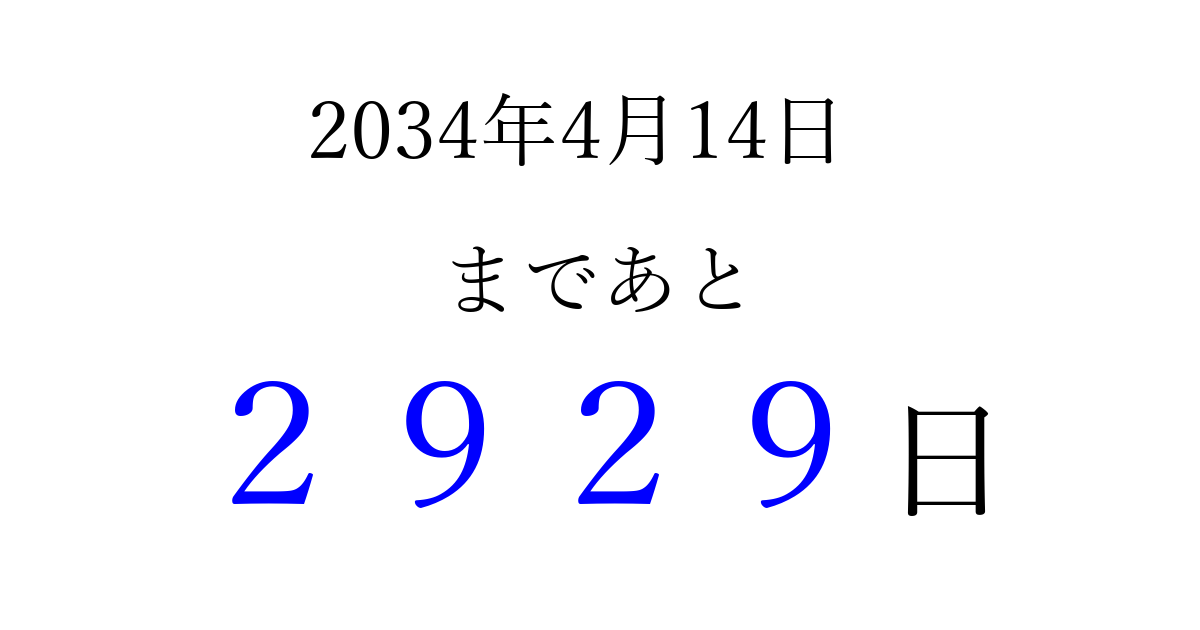 2034年4月14日(金)まで あと 9999 日です 追加すると、トップページからすぐ選べるようになります ※2026/04/07現在の結果です。 最新の状態に更新する ↓シェアして、タイムライン上にカウントダウンを表示しよう!↓ 📤 この結果を共有する Tweet シェア Threads Bluesky 別の日付でカウントダウン 2034年4月のカレンダー このページをブックマークに追加すると、いつでもカウントダウンを確認できます。 (PC: Ctrl+D / Mac: ⌘+D) hitome-notes.comでは以下のページも運営しています。 指定日と期間から日付を計算 | ガチャ確率計算・シミュレーション | プライバシー・ポリシー 運営者:Avocado