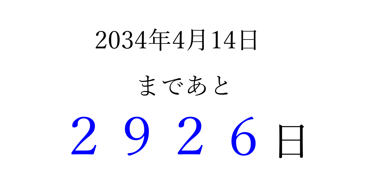 2034年4月14日(金)まで あと 9999 日です 追加すると、トップページからすぐ選べるようになります ※2026/04/10現在の結果です。 最新の状態に更新する ↓シェアして、タイムライン上にカウントダウンを表示しよう!↓ 📤 この結果を共有する Tweet シェア Threads Bluesky 別の日付でカウントダウン 2034年4月のカレンダー このページをブックマークに追加すると、いつでもカウントダウンを確認できます。 (PC: Ctrl+D / Mac: ⌘+D) hitome-notes.comでは以下のページも運営しています。 指定日と期間から日付を計算 | ガチャ確率計算・シミュレーション | プライバシー・ポリシー 運営者:Avocado