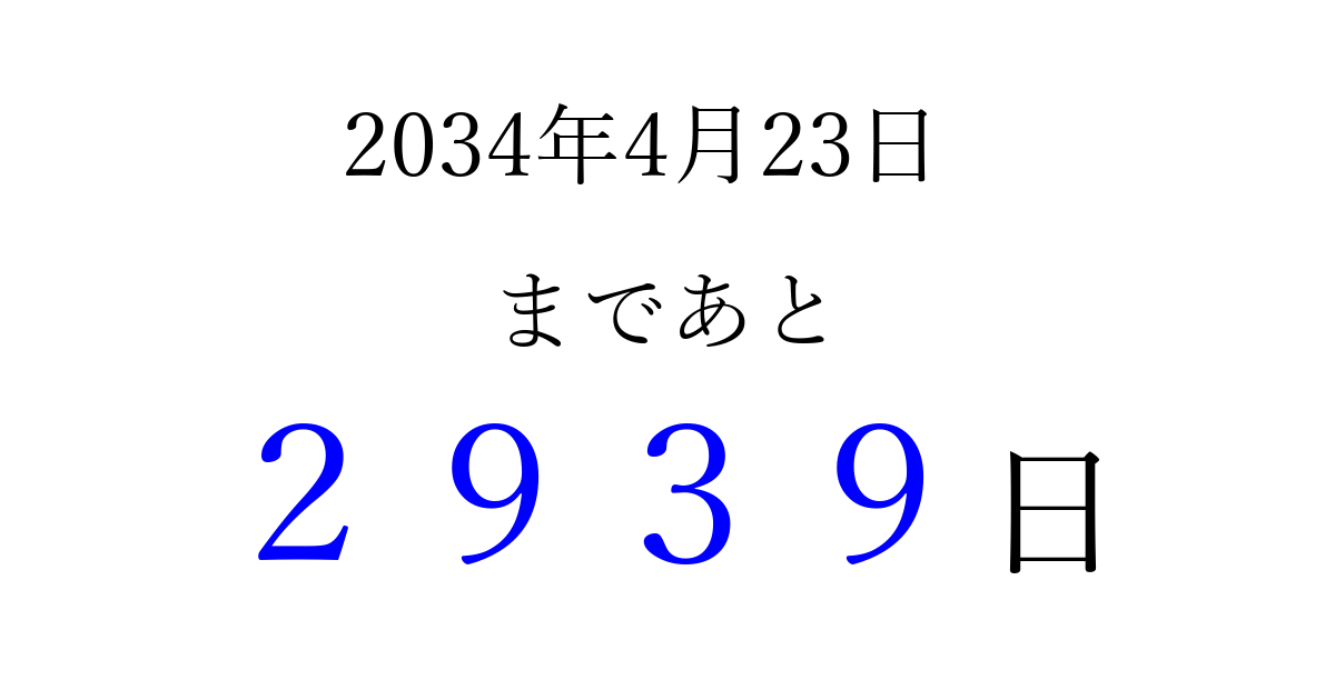 2034年4月23日(日)まで あと 9999 日です 追加すると、トップページからすぐ選べるようになります ※2026/04/06現在の結果です。 最新の状態に更新する ↓シェアして、タイムライン上にカウントダウンを表示しよう!↓ 📤 この結果を共有する Tweet シェア Threads Bluesky 別の日付でカウントダウン 2034年4月のカレンダー このページをブックマークに追加すると、いつでもカウントダウンを確認できます。 (PC: Ctrl+D / Mac: ⌘+D) hitome-notes.comでは以下のページも運営しています。 指定日と期間から日付を計算 | ガチャ確率計算・シミュレーション | プライバシー・ポリシー 運営者:Avocado