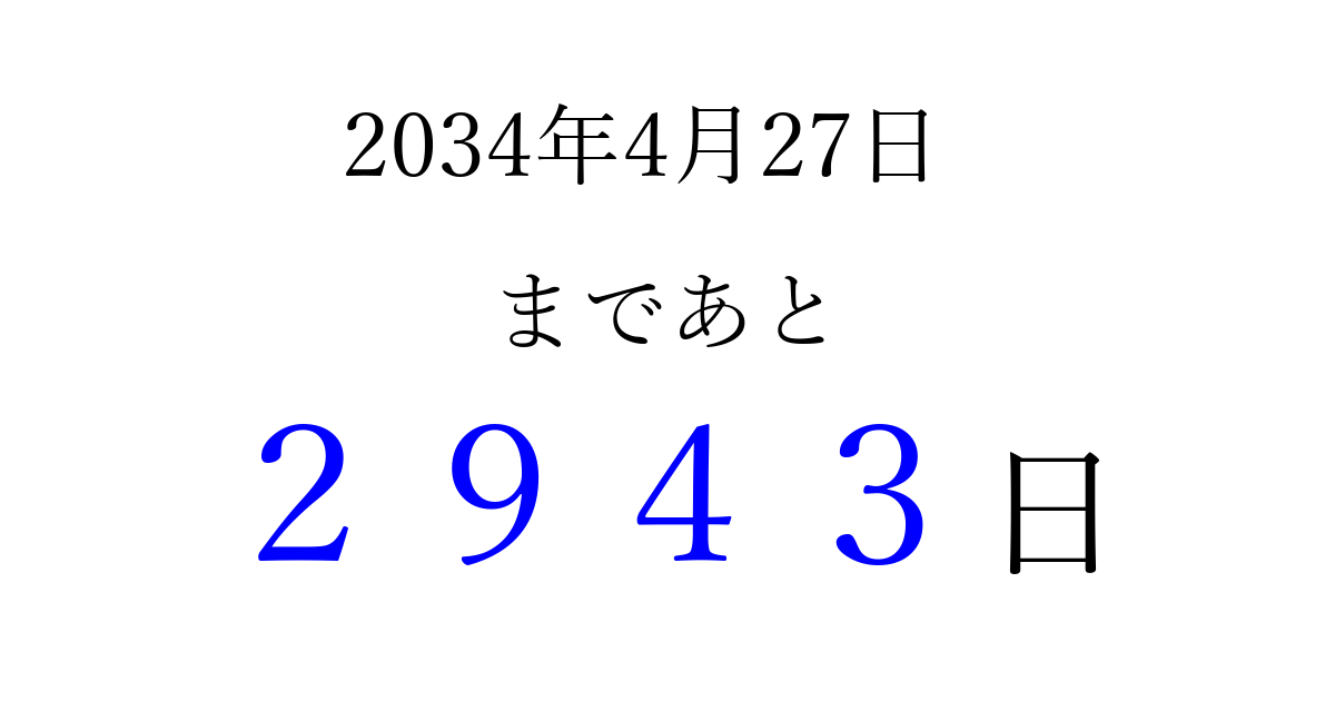 2034年4月27日(木)まで あと 9999 日です 追加すると、トップページからすぐ選べるようになります ※2026/04/06現在の結果です。 最新の状態に更新する ↓シェアして、タイムライン上にカウントダウンを表示しよう!↓ 📤 この結果を共有する Tweet シェア Threads Bluesky 別の日付でカウントダウン 2034年4月のカレンダー このページをブックマークに追加すると、いつでもカウントダウンを確認できます。 (PC: Ctrl+D / Mac: ⌘+D) hitome-notes.comでは以下のページも運営しています。 指定日と期間から日付を計算 | ガチャ確率計算・シミュレーション | プライバシー・ポリシー 運営者:Avocado