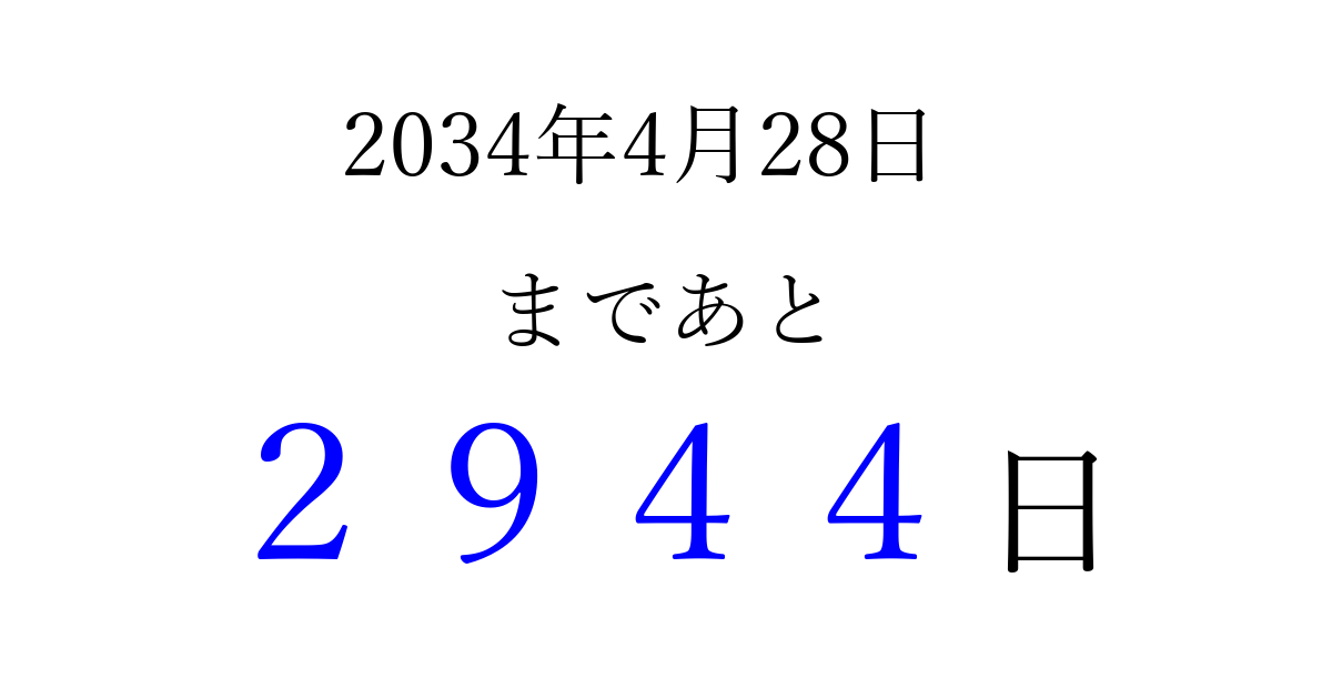 2034年4月28日(金)まで あと 9999 日です 追加すると、トップページからすぐ選べるようになります ※2026/04/06現在の結果です。 最新の状態に更新する ↓シェアして、タイムライン上にカウントダウンを表示しよう!↓ 📤 この結果を共有する Tweet シェア Threads Bluesky 別の日付でカウントダウン 2034年4月のカレンダー このページをブックマークに追加すると、いつでもカウントダウンを確認できます。 (PC: Ctrl+D / Mac: ⌘+D) hitome-notes.comでは以下のページも運営しています。 指定日と期間から日付を計算 | ガチャ確率計算・シミュレーション | プライバシー・ポリシー 運営者:Avocado