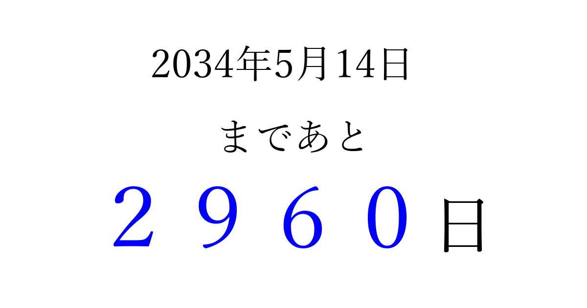 2034年5月14日(日)まで あと 9999 日です 追加すると、トップページからすぐ選べるようになります ※2026/04/06現在の結果です。 最新の状態に更新する ↓シェアして、タイムライン上にカウントダウンを表示しよう!↓ 📤 この結果を共有する Tweet シェア Threads Bluesky 別の日付でカウントダウン 2034年5月のカレンダー このページをブックマークに追加すると、いつでもカウントダウンを確認できます。 (PC: Ctrl+D / Mac: ⌘+D) hitome-notes.comでは以下のページも運営しています。 指定日と期間から日付を計算 | ガチャ確率計算・シミュレーション | プライバシー・ポリシー 運営者:Avocado