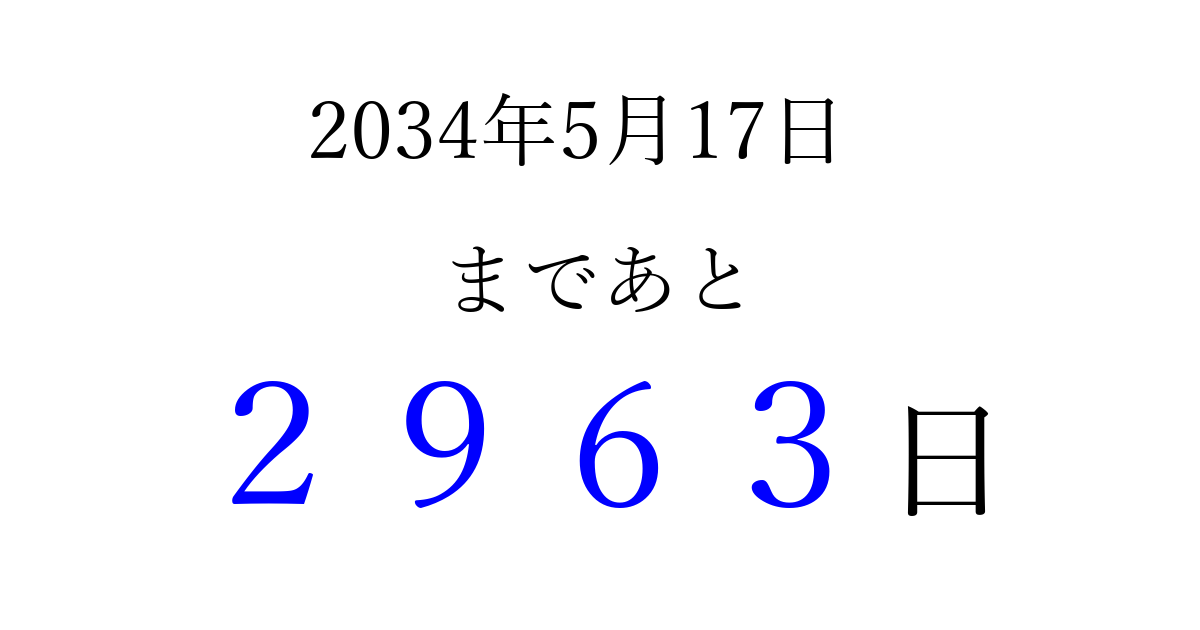 2034年5月17日(水)まで あと 9999 日です 追加すると、トップページからすぐ選べるようになります ※2026/04/06現在の結果です。 最新の状態に更新する ↓シェアして、タイムライン上にカウントダウンを表示しよう!↓ 📤 この結果を共有する Tweet シェア Threads Bluesky 別の日付でカウントダウン 2034年5月のカレンダー このページをブックマークに追加すると、いつでもカウントダウンを確認できます。 (PC: Ctrl+D / Mac: ⌘+D) hitome-notes.comでは以下のページも運営しています。 指定日と期間から日付を計算 | ガチャ確率計算・シミュレーション | プライバシー・ポリシー 運営者:Avocado