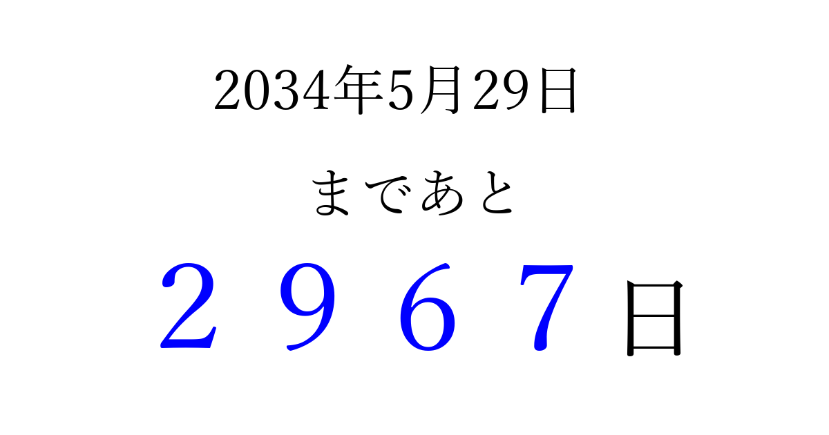 2034年5月29日(月)まで あと 9999 日です 追加すると、トップページからすぐ選べるようになります ※2026/04/14現在の結果です。 最新の状態に更新する ↓シェアして、タイムライン上にカウントダウンを表示しよう!↓ 📤 この結果を共有する Tweet シェア Threads Bluesky 別の日付でカウントダウン 2034年5月のカレンダー このページをブックマークに追加すると、いつでもカウントダウンを確認できます。 (PC: Ctrl+D / Mac: ⌘+D) hitome-notes.comでは以下のページも運営しています。 指定日と期間から日付を計算 | ガチャ確率計算・シミュレーション | プライバシー・ポリシー 運営者:Avocado