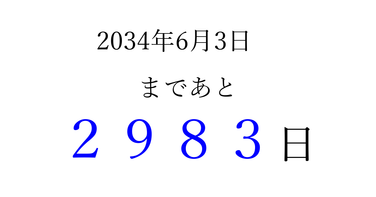 2034年6月3日(土)まで あと 9999 日です 追加すると、トップページからすぐ選べるようになります ※2026/04/03現在の結果です。 最新の状態に更新する ↓シェアして、タイムライン上にカウントダウンを表示しよう!↓ 📤 この結果を共有する Tweet シェア Threads Bluesky 別の日付でカウントダウン 2034年6月のカレンダー このページをブックマークに追加すると、いつでもカウントダウンを確認できます。 (PC: Ctrl+D / Mac: ⌘+D) hitome-notes.comでは以下のページも運営しています。 指定日と期間から日付を計算 | ガチャ確率計算・シミュレーション | プライバシー・ポリシー 運営者:Avocado