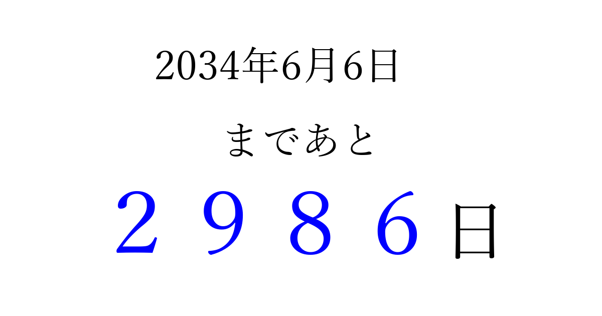 2034年6月6日(火)まで あと 9999 日です 追加すると、トップページからすぐ選べるようになります ※2026/04/03現在の結果です。 最新の状態に更新する ↓シェアして、タイムライン上にカウントダウンを表示しよう!↓ 📤 この結果を共有する Tweet シェア Threads Bluesky 別の日付でカウントダウン 2034年6月のカレンダー このページをブックマークに追加すると、いつでもカウントダウンを確認できます。 (PC: Ctrl+D / Mac: ⌘+D) hitome-notes.comでは以下のページも運営しています。 指定日と期間から日付を計算 | ガチャ確率計算・シミュレーション | プライバシー・ポリシー 運営者:Avocado