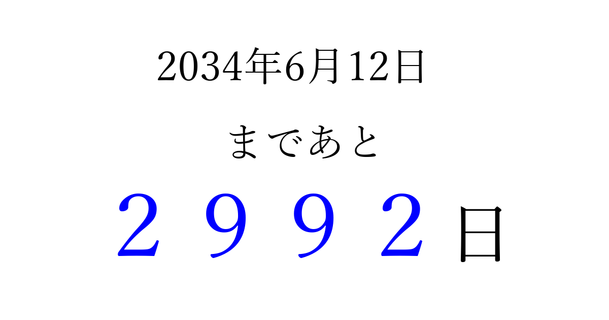 2034年6月12日(月)まで あと 9999 日です 追加すると、トップページからすぐ選べるようになります ※2026/04/03現在の結果です。 最新の状態に更新する ↓シェアして、タイムライン上にカウントダウンを表示しよう!↓ 📤 この結果を共有する Tweet シェア Threads Bluesky 別の日付でカウントダウン 2034年6月のカレンダー このページをブックマークに追加すると、いつでもカウントダウンを確認できます。 (PC: Ctrl+D / Mac: ⌘+D) hitome-notes.comでは以下のページも運営しています。 指定日と期間から日付を計算 | ガチャ確率計算・シミュレーション | プライバシー・ポリシー 運営者:Avocado