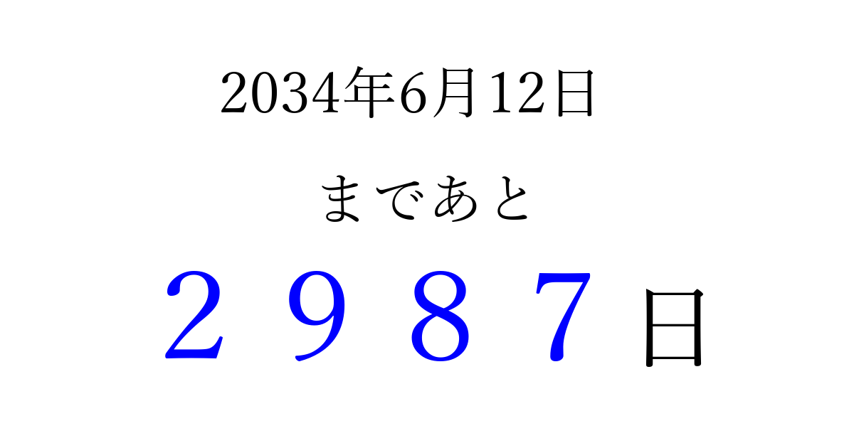 2034年6月12日(月)まで あと 9999 日です 追加すると、トップページからすぐ選べるようになります ※2026/04/08現在の結果です。 最新の状態に更新する ↓シェアして、タイムライン上にカウントダウンを表示しよう!↓ 📤 この結果を共有する Tweet シェア Threads Bluesky 別の日付でカウントダウン 2034年6月のカレンダー このページをブックマークに追加すると、いつでもカウントダウンを確認できます。 (PC: Ctrl+D / Mac: ⌘+D) hitome-notes.comでは以下のページも運営しています。 指定日と期間から日付を計算 | ガチャ確率計算・シミュレーション | プライバシー・ポリシー 運営者:Avocado