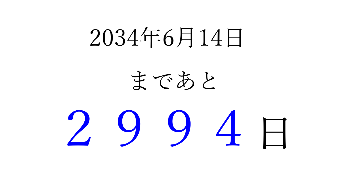 2034年6月14日(水)まで あと 9999 日です 追加すると、トップページからすぐ選べるようになります ※2026/04/03現在の結果です。 最新の状態に更新する ↓シェアして、タイムライン上にカウントダウンを表示しよう!↓ 📤 この結果を共有する Tweet シェア Threads Bluesky 別の日付でカウントダウン 2034年6月のカレンダー このページをブックマークに追加すると、いつでもカウントダウンを確認できます。 (PC: Ctrl+D / Mac: ⌘+D) hitome-notes.comでは以下のページも運営しています。 指定日と期間から日付を計算 | ガチャ確率計算・シミュレーション | プライバシー・ポリシー 運営者:Avocado
