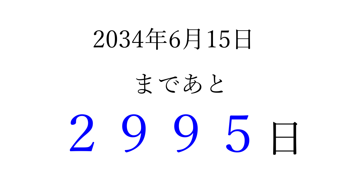2034年6月15日(木)まで あと 9999 日です 追加すると、トップページからすぐ選べるようになります ※2026/04/03現在の結果です。 最新の状態に更新する ↓シェアして、タイムライン上にカウントダウンを表示しよう!↓ 📤 この結果を共有する Tweet シェア Threads Bluesky 別の日付でカウントダウン 2034年6月のカレンダー このページをブックマークに追加すると、いつでもカウントダウンを確認できます。 (PC: Ctrl+D / Mac: ⌘+D) hitome-notes.comでは以下のページも運営しています。 指定日と期間から日付を計算 | ガチャ確率計算・シミュレーション | プライバシー・ポリシー 運営者:Avocado