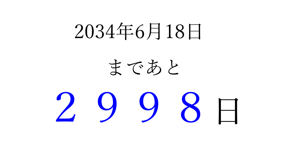 2034年6月18日(日)まで あと 9999 日です 追加すると、トップページからすぐ選べるようになります ※2026/04/03現在の結果です。 最新の状態に更新する ↓シェアして、タイムライン上にカウントダウンを表示しよう!↓ 📤 この結果を共有する Tweet シェア Threads Bluesky 別の日付でカウントダウン 2034年6月のカレンダー このページをブックマークに追加すると、いつでもカウントダウンを確認できます。 (PC: Ctrl+D / Mac: ⌘+D) hitome-notes.comでは以下のページも運営しています。 指定日と期間から日付を計算 | ガチャ確率計算・シミュレーション | プライバシー・ポリシー 運営者:Avocado