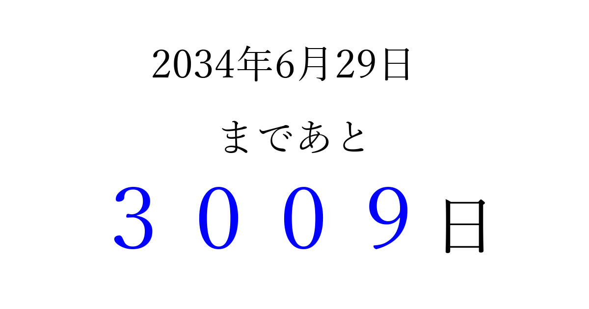 2034年6月29日(木)まで あと 9999 日です 追加すると、トップページからすぐ選べるようになります ※2026/04/03現在の結果です。 最新の状態に更新する ↓シェアして、タイムライン上にカウントダウンを表示しよう!↓ 📤 この結果を共有する Tweet シェア Threads Bluesky 別の日付でカウントダウン 2034年6月のカレンダー このページをブックマークに追加すると、いつでもカウントダウンを確認できます。 (PC: Ctrl+D / Mac: ⌘+D) hitome-notes.comでは以下のページも運営しています。 指定日と期間から日付を計算 | ガチャ確率計算・シミュレーション | プライバシー・ポリシー 運営者:Avocado