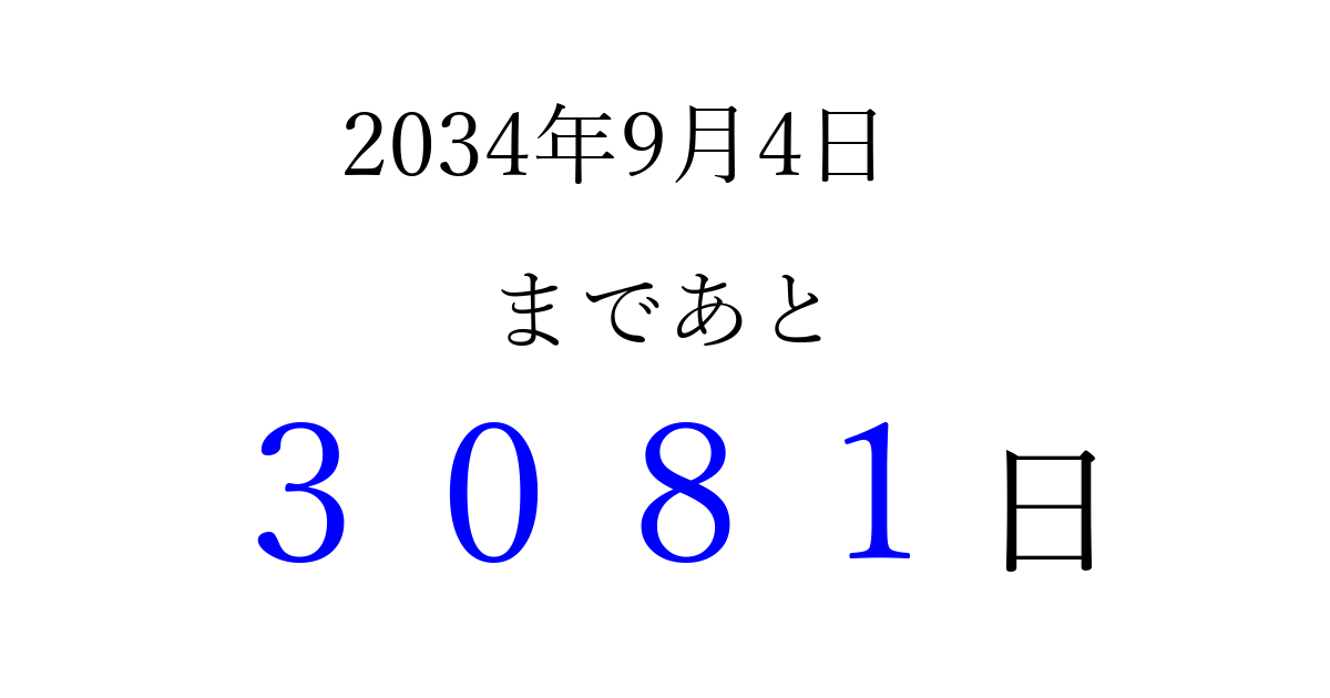 2034年9月4日(月)まで あと 9999 日です 追加すると、トップページからすぐ選べるようになります ※2026/03/29現在の結果です。 最新の状態に更新する ↓シェアして、タイムライン上にカウントダウンを表示しよう!↓ 📤 この結果を共有する Tweet シェア Threads Bluesky 別の日付でカウントダウン 2034年9月のカレンダー このページをブックマークに追加すると、いつでもカウントダウンを確認できます。 (PC: Ctrl+D / Mac: ⌘+D) hitome-notes.comでは以下のページも運営しています。 指定日と期間から日付を計算 | ガチャ確率計算・シミュレーション | プライバシー・ポリシー 運営者:Avocado