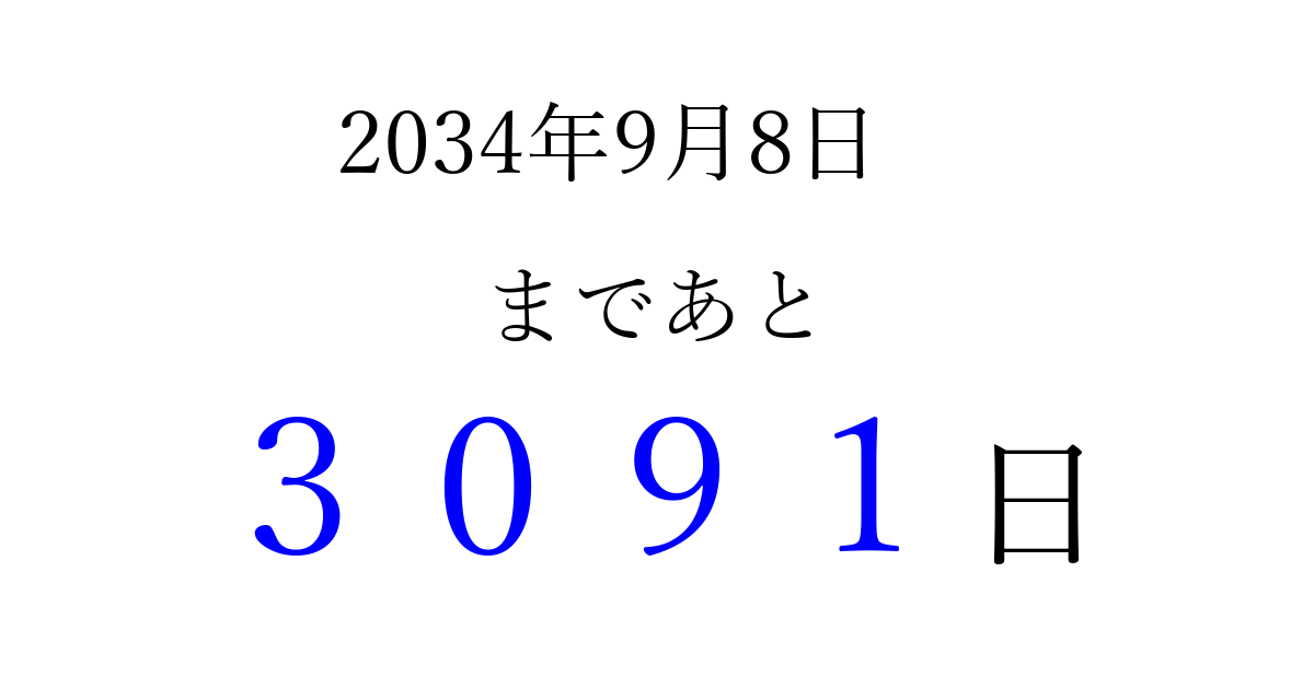 2034年9月8日(金)まで あと 9999 日です 追加すると、トップページからすぐ選べるようになります ※2026/03/23現在の結果です。 最新の状態に更新する ↓シェアして、タイムライン上にカウントダウンを表示しよう!↓ 📤 この結果を共有する Tweet シェア Threads Bluesky 別の日付でカウントダウン 2034年9月のカレンダー このページをブックマークに追加すると、いつでもカウントダウンを確認できます。 (PC: Ctrl+D / Mac: ⌘+D) hitome-notes.comでは以下のページも運営しています。 指定日と期間から日付を計算 | ガチャ確率計算・シミュレーション | プライバシー・ポリシー 運営者:Avocado