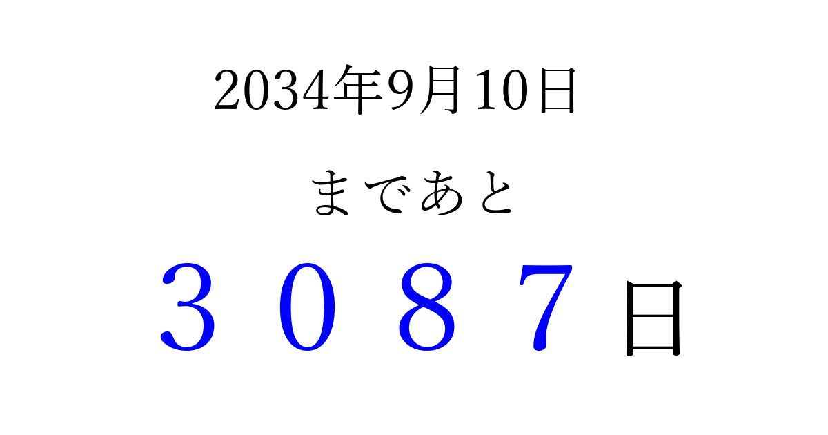 2034年9月10日(日)まで あと 9999 日です 追加すると、トップページからすぐ選べるようになります ※2026/03/29現在の結果です。 最新の状態に更新する ↓シェアして、タイムライン上にカウントダウンを表示しよう!↓ 📤 この結果を共有する Tweet シェア Threads Bluesky 別の日付でカウントダウン 2034年9月のカレンダー このページをブックマークに追加すると、いつでもカウントダウンを確認できます。 (PC: Ctrl+D / Mac: ⌘+D) hitome-notes.comでは以下のページも運営しています。 指定日と期間から日付を計算 | ガチャ確率計算・シミュレーション | プライバシー・ポリシー 運営者:Avocado