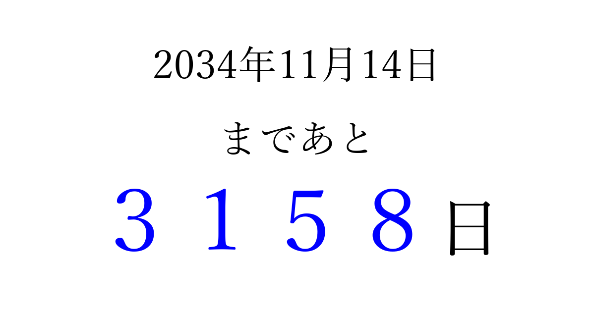 2034年11月14日(火)まで あと 9999 日です 追加すると、トップページからすぐ選べるようになります ※2026/03/23現在の結果です。 最新の状態に更新する ↓シェアして、タイムライン上にカウントダウンを表示しよう!↓ 📤 この結果を共有する Tweet シェア Threads Bluesky 別の日付でカウントダウン 2034年11月のカレンダー このページをブックマークに追加すると、いつでもカウントダウンを確認できます。 (PC: Ctrl+D / Mac: ⌘+D) hitome-notes.comでは以下のページも運営しています。 指定日と期間から日付を計算 | ガチャ確率計算・シミュレーション | プライバシー・ポリシー 運営者:Avocado