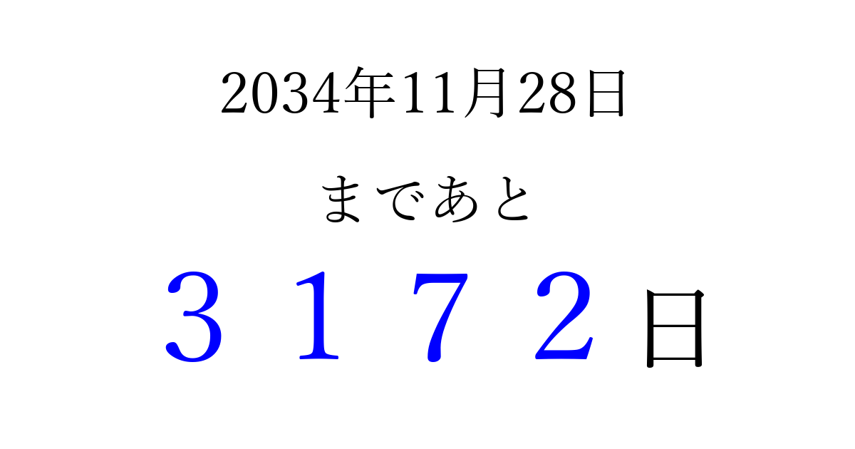2034年11月28日(火)まで あと 9999 日です 追加すると、トップページからすぐ選べるようになります ※2026/03/23現在の結果です。 最新の状態に更新する ↓シェアして、タイムライン上にカウントダウンを表示しよう!↓ 📤 この結果を共有する Tweet シェア Threads Bluesky 別の日付でカウントダウン 2034年11月のカレンダー このページをブックマークに追加すると、いつでもカウントダウンを確認できます。 (PC: Ctrl+D / Mac: ⌘+D) hitome-notes.comでは以下のページも運営しています。 指定日と期間から日付を計算 | ガチャ確率計算・シミュレーション | プライバシー・ポリシー 運営者:Avocado