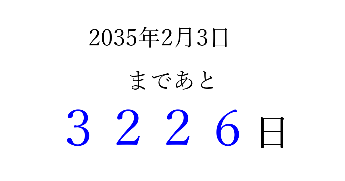 2035年2月3日(土)まで あと 9999 日です 追加すると、トップページからすぐ選べるようになります ※2026/04/05現在の結果です。 最新の状態に更新する ↓シェアして、タイムライン上にカウントダウンを表示しよう!↓ 📤 この結果を共有する Tweet シェア Threads Bluesky 別の日付でカウントダウン 2035年2月のカレンダー このページをブックマークに追加すると、いつでもカウントダウンを確認できます。 (PC: Ctrl+D / Mac: ⌘+D) hitome-notes.comでは以下のページも運営しています。 指定日と期間から日付を計算 | ガチャ確率計算・シミュレーション | プライバシー・ポリシー 運営者:Avocado