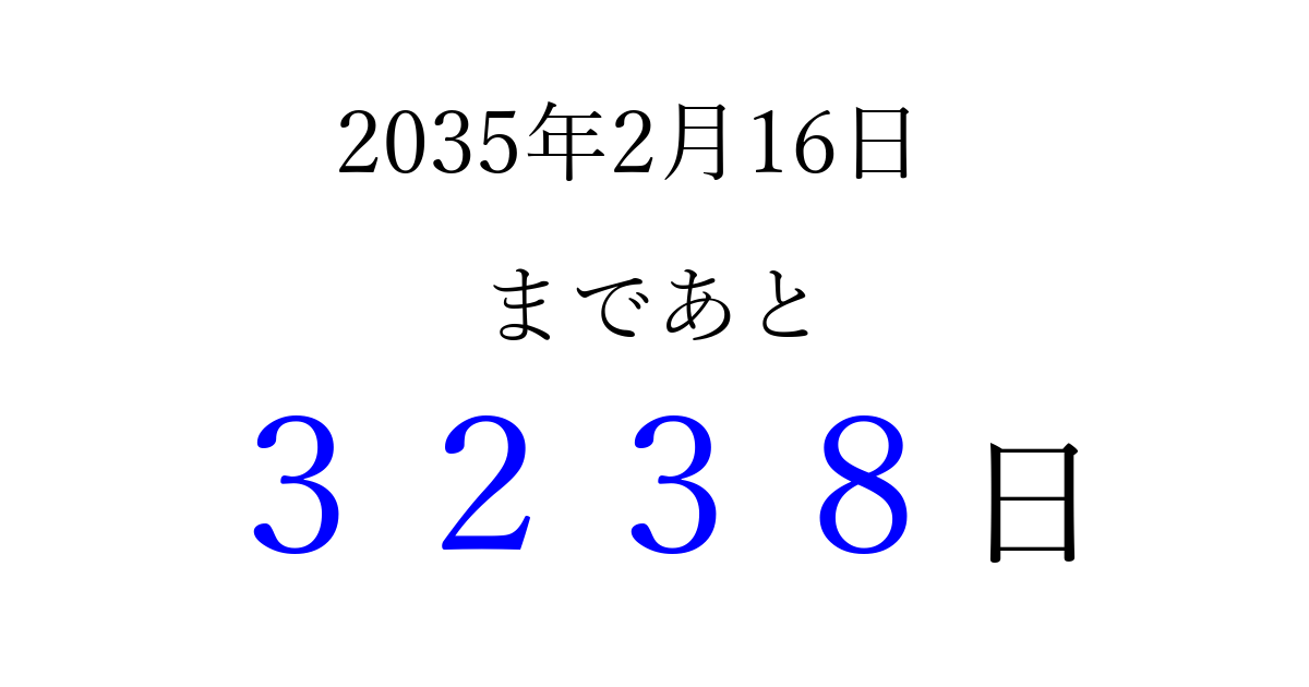 2035年2月16日(金)まで あと 9999 日です 追加すると、トップページからすぐ選べるようになります ※2026/04/06現在の結果です。 最新の状態に更新する ↓シェアして、タイムライン上にカウントダウンを表示しよう!↓ 📤 この結果を共有する Tweet シェア Threads Bluesky 別の日付でカウントダウン 2035年2月のカレンダー このページをブックマークに追加すると、いつでもカウントダウンを確認できます。 (PC: Ctrl+D / Mac: ⌘+D) hitome-notes.comでは以下のページも運営しています。 指定日と期間から日付を計算 | ガチャ確率計算・シミュレーション | プライバシー・ポリシー 運営者:Avocado
