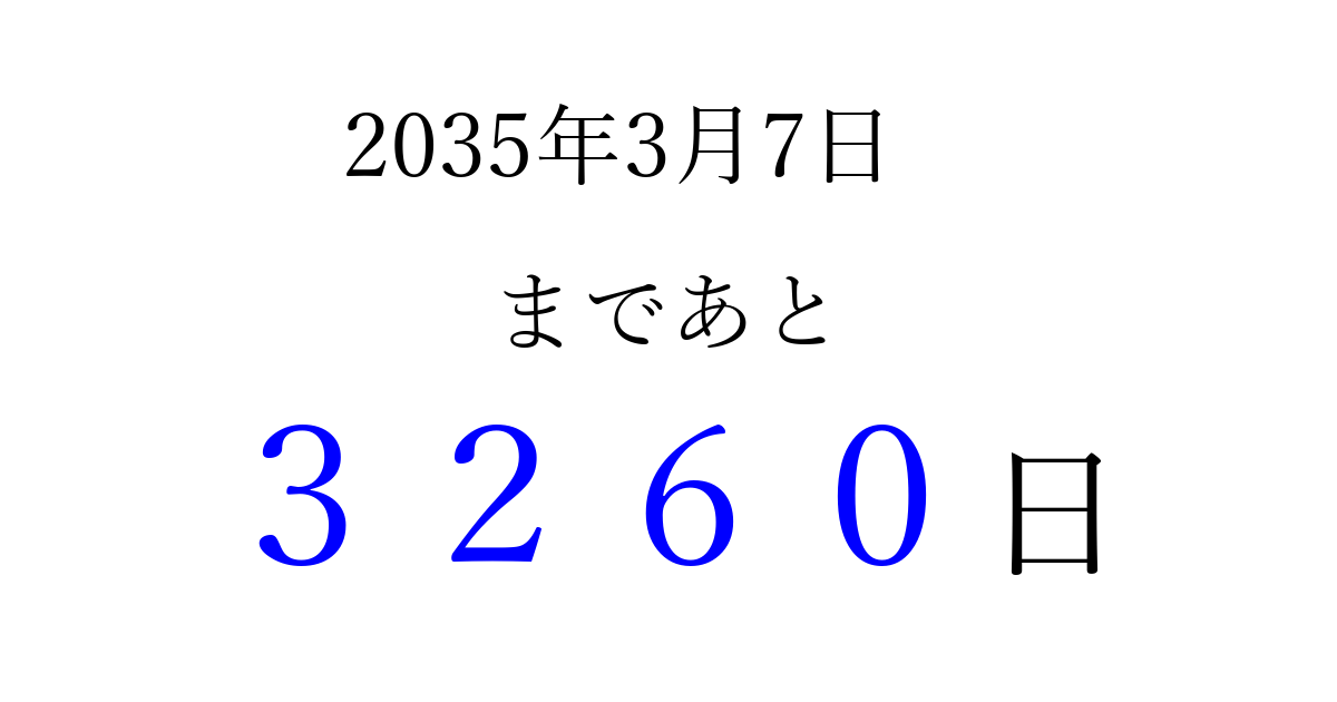2035年3月7日(水)まで あと 9999 日です 追加すると、トップページからすぐ選べるようになります ※2026/04/03現在の結果です。 最新の状態に更新する ↓シェアして、タイムライン上にカウントダウンを表示しよう!↓ 📤 この結果を共有する Tweet シェア Threads Bluesky 別の日付でカウントダウン 2035年3月のカレンダー このページをブックマークに追加すると、いつでもカウントダウンを確認できます。 (PC: Ctrl+D / Mac: ⌘+D) hitome-notes.comでは以下のページも運営しています。 指定日と期間から日付を計算 | ガチャ確率計算・シミュレーション | プライバシー・ポリシー 運営者:Avocado
