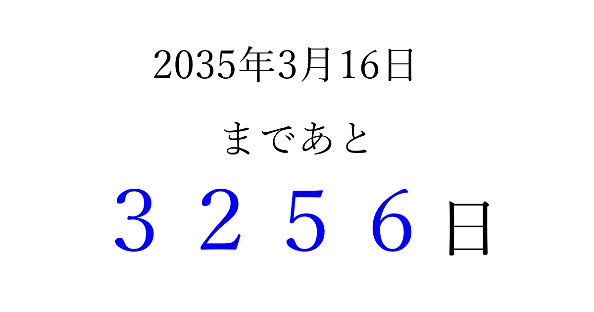 2035年3月16日(金)まで あと 9999 日です 追加すると、トップページからすぐ選べるようになります ※2026/04/16現在の結果です。 最新の状態に更新する ↓シェアして、タイムライン上にカウントダウンを表示しよう!↓ 📤 この結果を共有する Tweet シェア Threads Bluesky 別の日付でカウントダウン 2035年3月のカレンダー このページをブックマークに追加すると、いつでもカウントダウンを確認できます。 (PC: Ctrl+D / Mac: ⌘+D) hitome-notes.comでは以下のページも運営しています。 指定日と期間から日付を計算 | ガチャ確率計算・シミュレーション | プライバシー・ポリシー 運営者:Avocado