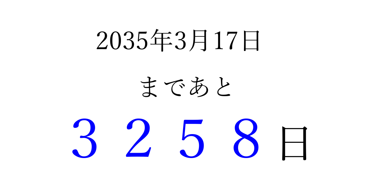 2035年3月17日(土)まで あと 9999 日です 追加すると、トップページからすぐ選べるようになります ※2026/04/15現在の結果です。 最新の状態に更新する ↓シェアして、タイムライン上にカウントダウンを表示しよう!↓ 📤 この結果を共有する Tweet シェア Threads Bluesky 別の日付でカウントダウン 2035年3月のカレンダー このページをブックマークに追加すると、いつでもカウントダウンを確認できます。 (PC: Ctrl+D / Mac: ⌘+D) hitome-notes.comでは以下のページも運営しています。 指定日と期間から日付を計算 | ガチャ確率計算・シミュレーション | プライバシー・ポリシー 運営者:Avocado