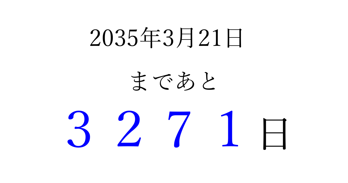2035年3月21日(水)まで あと 9999 日です 追加すると、トップページからすぐ選べるようになります ※2026/04/06現在の結果です。 最新の状態に更新する ↓シェアして、タイムライン上にカウントダウンを表示しよう!↓ 📤 この結果を共有する Tweet シェア Threads Bluesky 別の日付でカウントダウン 2035年3月のカレンダー このページをブックマークに追加すると、いつでもカウントダウンを確認できます。 (PC: Ctrl+D / Mac: ⌘+D) hitome-notes.comでは以下のページも運営しています。 指定日と期間から日付を計算 | ガチャ確率計算・シミュレーション | プライバシー・ポリシー 運営者:Avocado