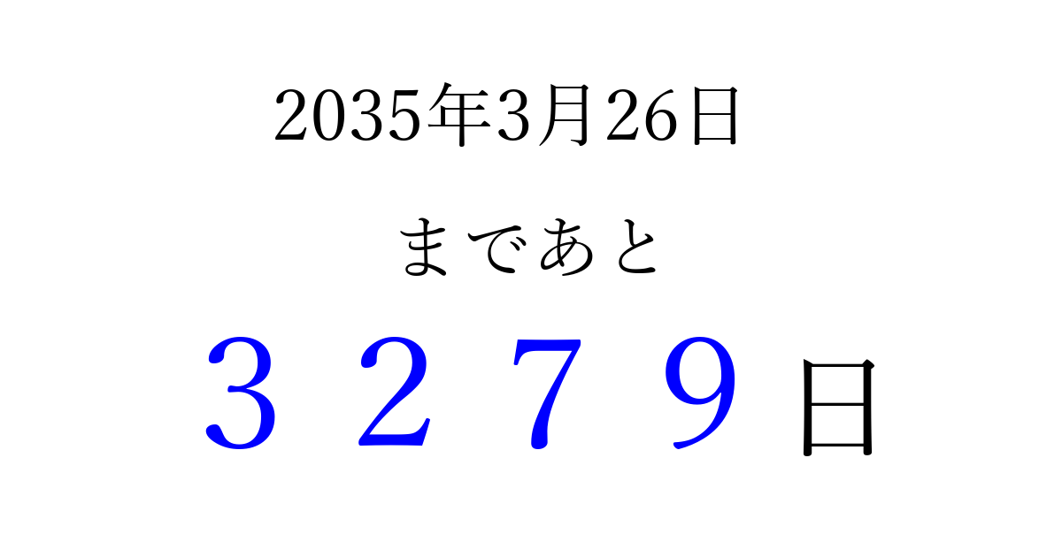 2035年3月26日(月)まで あと 9999 日です 追加すると、トップページからすぐ選べるようになります ※2026/04/03現在の結果です。 最新の状態に更新する ↓シェアして、タイムライン上にカウントダウンを表示しよう!↓ 📤 この結果を共有する Tweet シェア Threads Bluesky 別の日付でカウントダウン 2035年3月のカレンダー このページをブックマークに追加すると、いつでもカウントダウンを確認できます。 (PC: Ctrl+D / Mac: ⌘+D) hitome-notes.comでは以下のページも運営しています。 指定日と期間から日付を計算 | ガチャ確率計算・シミュレーション | プライバシー・ポリシー 運営者:Avocado