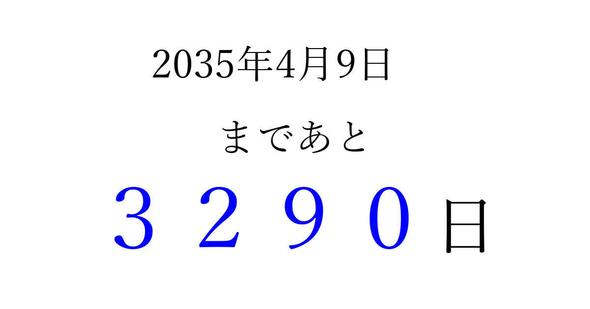 2035年4月9日(月)まで あと 9999 日です 追加すると、トップページからすぐ選べるようになります ※2026/04/06現在の結果です。 最新の状態に更新する ↓シェアして、タイムライン上にカウントダウンを表示しよう!↓ 📤 この結果を共有する Tweet シェア Threads Bluesky 別の日付でカウントダウン 2035年4月のカレンダー このページをブックマークに追加すると、いつでもカウントダウンを確認できます。 (PC: Ctrl+D / Mac: ⌘+D) hitome-notes.comでは以下のページも運営しています。 指定日と期間から日付を計算 | ガチャ確率計算・シミュレーション | プライバシー・ポリシー 運営者:Avocado