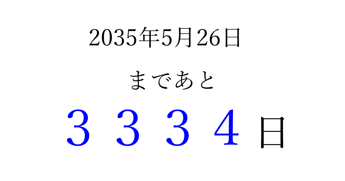 2035年5月26日(土)まで あと 9999 日です 追加すると、トップページからすぐ選べるようになります ※2026/04/09現在の結果です。 最新の状態に更新する ↓シェアして、タイムライン上にカウントダウンを表示しよう!↓ 📤 この結果を共有する Tweet シェア Threads Bluesky 別の日付でカウントダウン 2035年5月のカレンダー このページをブックマークに追加すると、いつでもカウントダウンを確認できます。 (PC: Ctrl+D / Mac: ⌘+D) hitome-notes.comでは以下のページも運営しています。 指定日と期間から日付を計算 | ガチャ確率計算・シミュレーション | プライバシー・ポリシー 運営者:Avocado