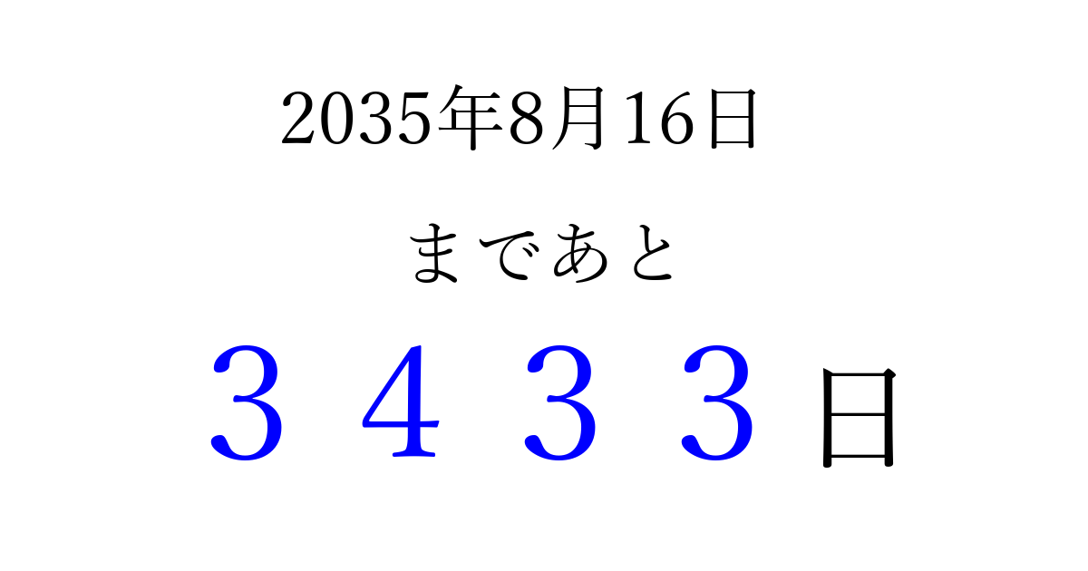 2035年8月16日(木)まで あと 9999 日です 追加すると、トップページからすぐ選べるようになります ※2026/03/23現在の結果です。 最新の状態に更新する ↓シェアして、タイムライン上にカウントダウンを表示しよう!↓ 📤 この結果を共有する Tweet シェア Threads Bluesky 別の日付でカウントダウン 2035年8月のカレンダー このページをブックマークに追加すると、いつでもカウントダウンを確認できます。 (PC: Ctrl+D / Mac: ⌘+D) hitome-notes.comでは以下のページも運営しています。 指定日と期間から日付を計算 | ガチャ確率計算・シミュレーション | プライバシー・ポリシー 運営者:Avocado