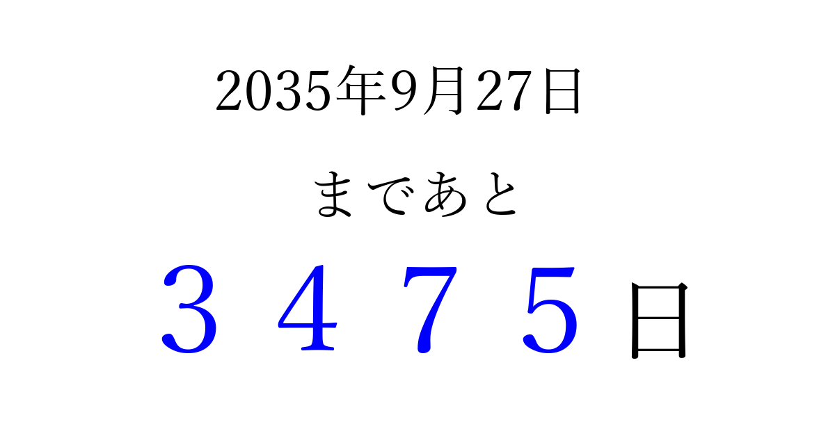 2035年9月27日(木)まで あと 9999 日です 追加すると、トップページからすぐ選べるようになります ※2026/03/23現在の結果です。 最新の状態に更新する ↓シェアして、タイムライン上にカウントダウンを表示しよう!↓ 📤 この結果を共有する Tweet シェア Threads Bluesky 別の日付でカウントダウン 2035年9月のカレンダー このページをブックマークに追加すると、いつでもカウントダウンを確認できます。 (PC: Ctrl+D / Mac: ⌘+D) hitome-notes.comでは以下のページも運営しています。 指定日と期間から日付を計算 | ガチャ確率計算・シミュレーション | プライバシー・ポリシー 運営者:Avocado