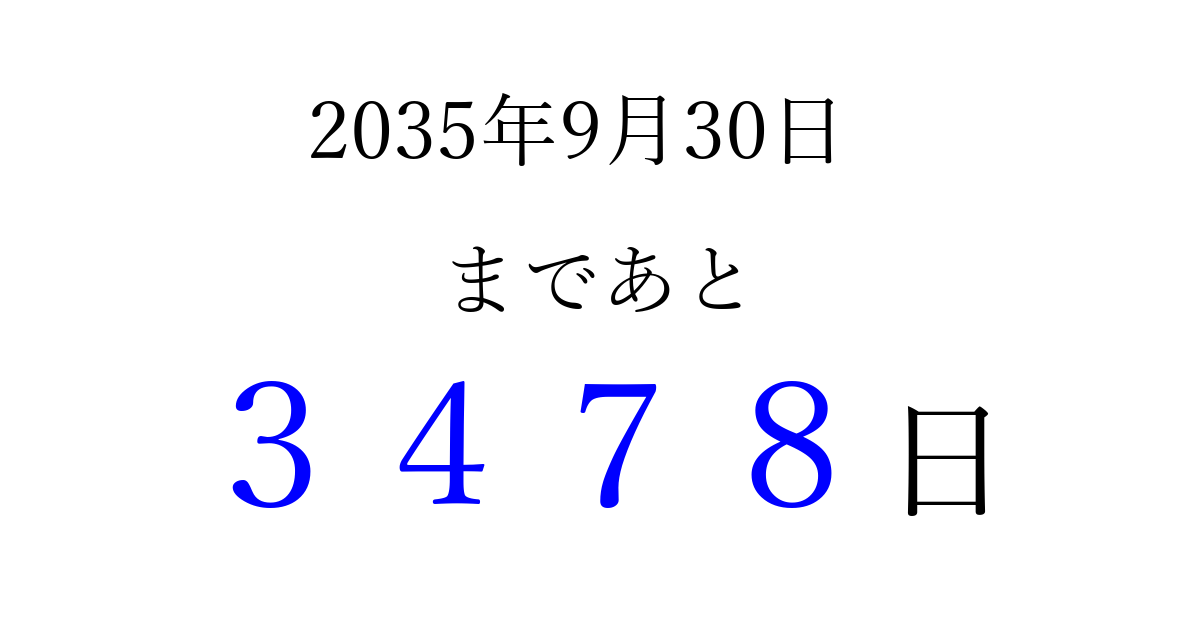 2035年9月30日(日)まで あと 9999 日です 追加すると、トップページからすぐ選べるようになります ※2026/03/23現在の結果です。 最新の状態に更新する ↓シェアして、タイムライン上にカウントダウンを表示しよう!↓ 📤 この結果を共有する Tweet シェア Threads Bluesky 別の日付でカウントダウン 2035年9月のカレンダー このページをブックマークに追加すると、いつでもカウントダウンを確認できます。 (PC: Ctrl+D / Mac: ⌘+D) hitome-notes.comでは以下のページも運営しています。 指定日と期間から日付を計算 | ガチャ確率計算・シミュレーション | プライバシー・ポリシー 運営者:Avocado