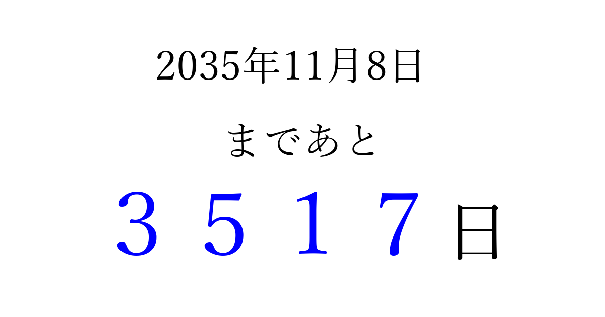 2035年11月8日(木)まで あと 9999 日です 追加すると、トップページからすぐ選べるようになります ※2026/03/23現在の結果です。 最新の状態に更新する ↓シェアして、タイムライン上にカウントダウンを表示しよう!↓ 📤 この結果を共有する Tweet シェア Threads Bluesky 別の日付でカウントダウン 2035年11月のカレンダー このページをブックマークに追加すると、いつでもカウントダウンを確認できます。 (PC: Ctrl+D / Mac: ⌘+D) hitome-notes.comでは以下のページも運営しています。 指定日と期間から日付を計算 | ガチャ確率計算・シミュレーション | プライバシー・ポリシー 運営者:Avocado