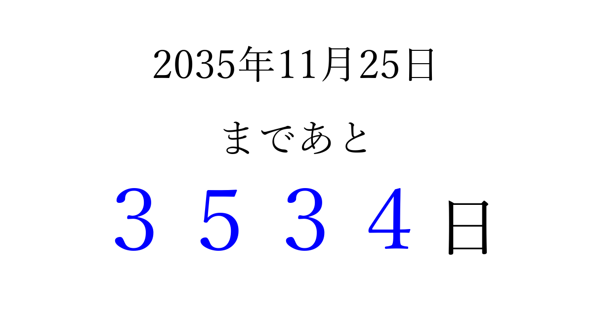 2035年11月25日(日)まで あと 9999 日です 追加すると、トップページからすぐ選べるようになります ※2026/03/23現在の結果です。 最新の状態に更新する ↓シェアして、タイムライン上にカウントダウンを表示しよう!↓ 📤 この結果を共有する Tweet シェア Threads Bluesky 別の日付でカウントダウン 2035年11月のカレンダー このページをブックマークに追加すると、いつでもカウントダウンを確認できます。 (PC: Ctrl+D / Mac: ⌘+D) hitome-notes.comでは以下のページも運営しています。 指定日と期間から日付を計算 | ガチャ確率計算・シミュレーション | プライバシー・ポリシー 運営者:Avocado