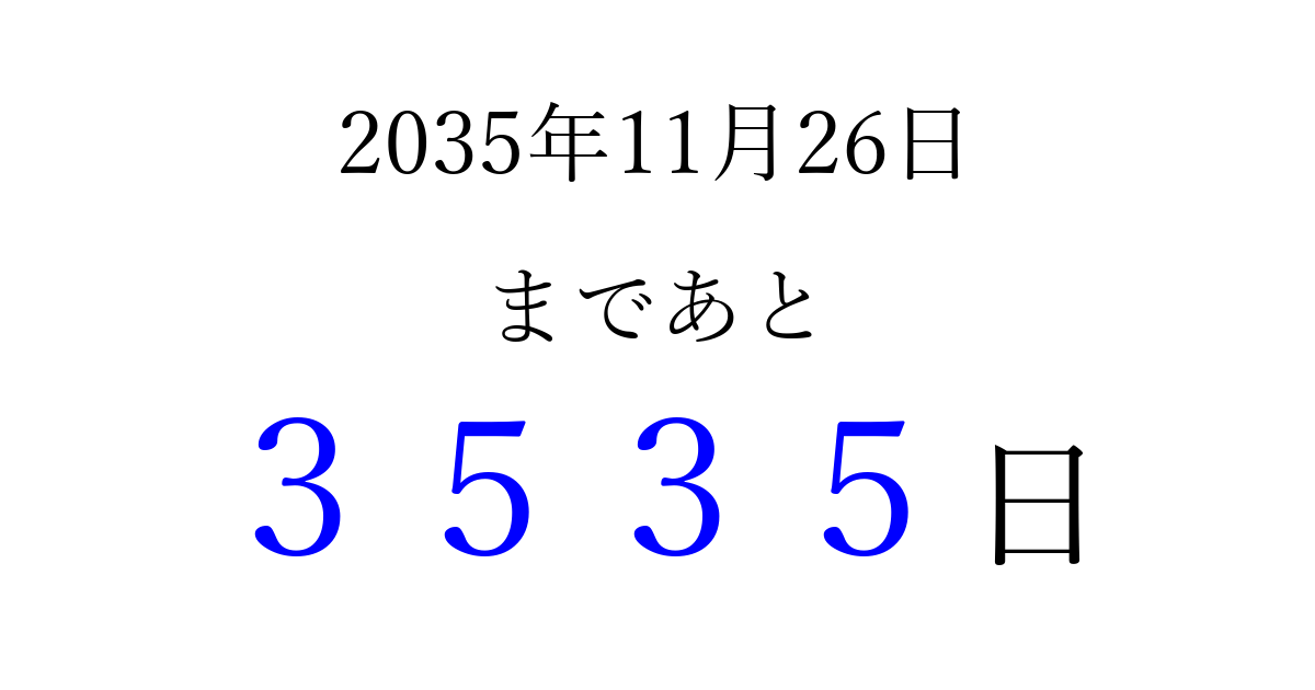 2035年11月26日(月)まで あと 9999 日です 追加すると、トップページからすぐ選べるようになります ※2026/03/23現在の結果です。 最新の状態に更新する ↓シェアして、タイムライン上にカウントダウンを表示しよう!↓ 📤 この結果を共有する Tweet シェア Threads Bluesky 別の日付でカウントダウン 2035年11月のカレンダー このページをブックマークに追加すると、いつでもカウントダウンを確認できます。 (PC: Ctrl+D / Mac: ⌘+D) hitome-notes.comでは以下のページも運営しています。 指定日と期間から日付を計算 | ガチャ確率計算・シミュレーション | プライバシー・ポリシー 運営者:Avocado